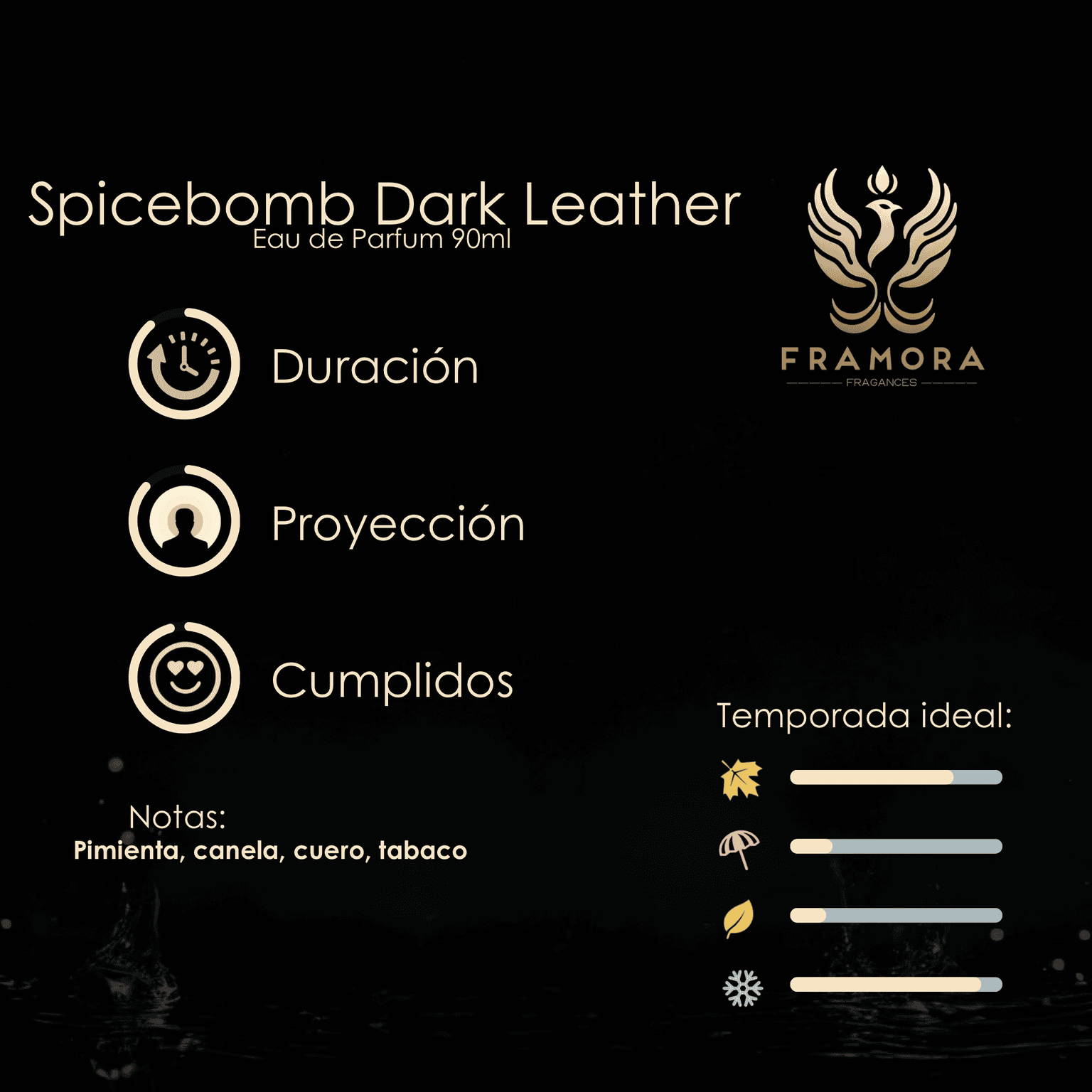 Spicebomb Dark Leather es una fragancia profunda y envolvente, que combina especias intensas con un corazón de cuero oscuro y un fondo cálido de maderas. Perfecta para el hombre que busca elegancia con un toque rebelde.