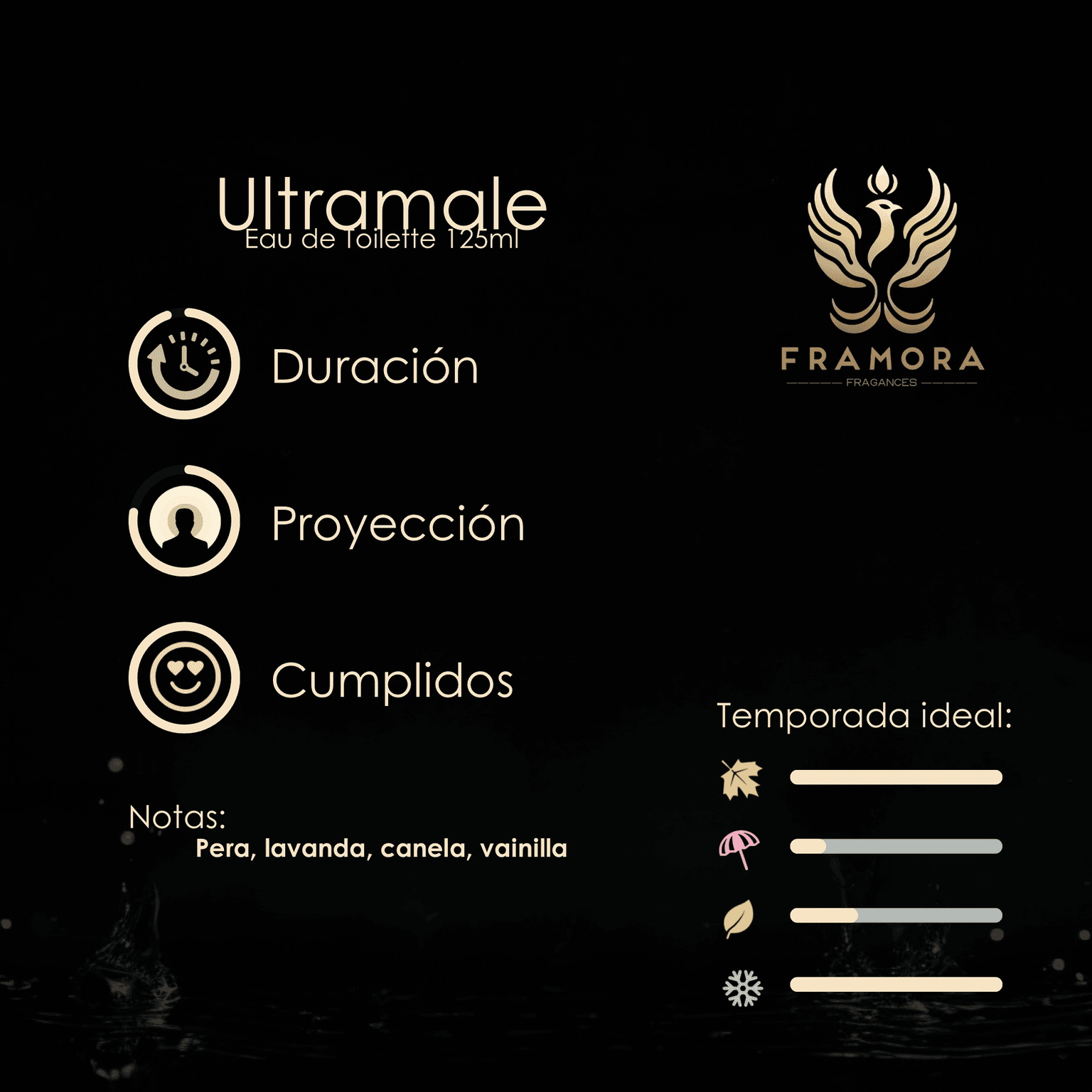 Ultra Male es una fragancia intensa y provocadora, donde la frescura de la pera se mezcla con especias cálidas y un fondo dulce de vainilla y ámbar. Ideal para el hombre audaz y seductor.